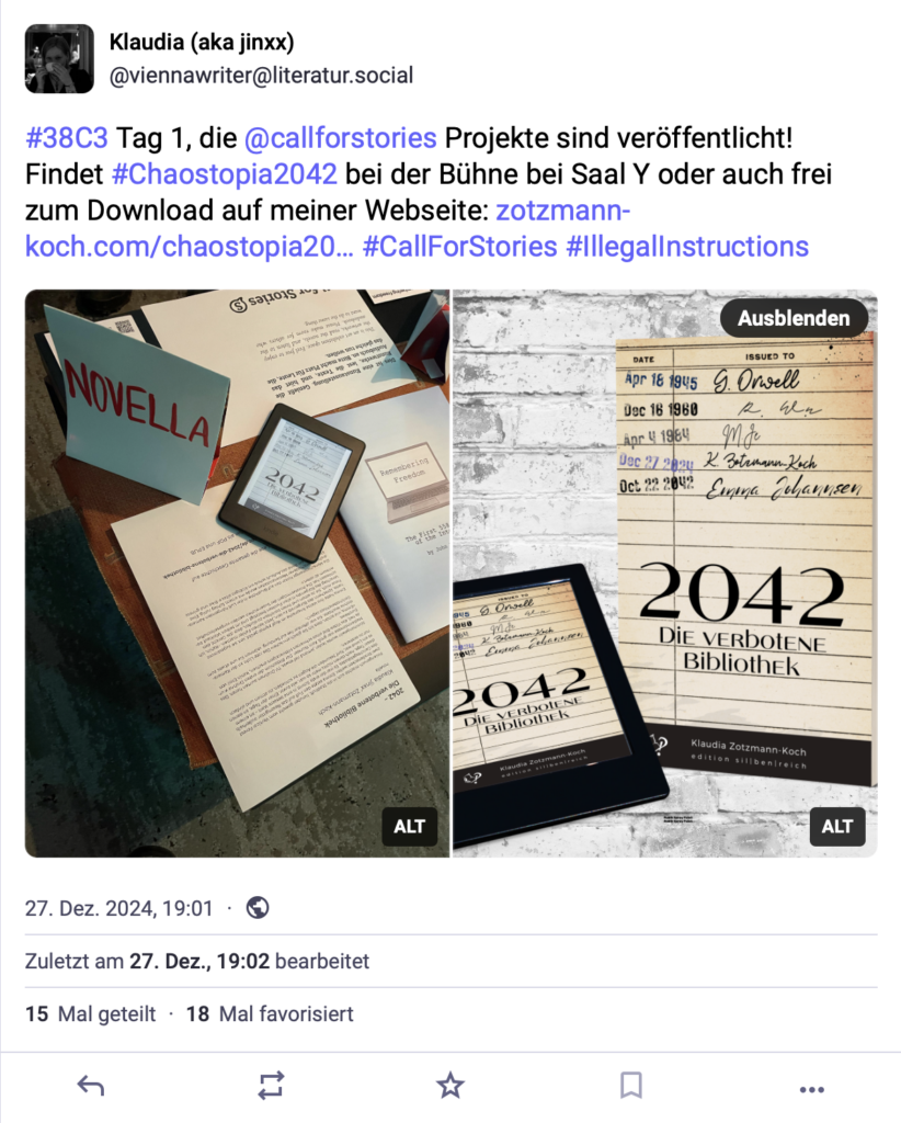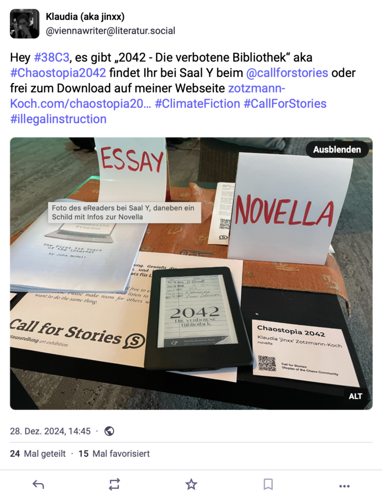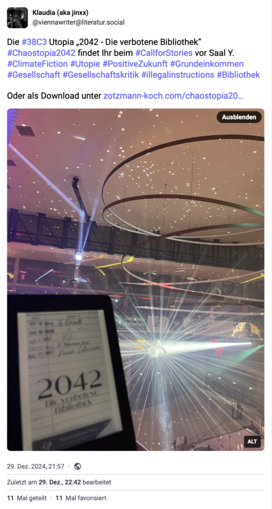 Das Buch habe ich im Rahmen des „Call for Stories 42“ des CCC geschrieben; dabei ging es darum, konkrete positive Zukunftsbilder zu entwerfen. Das war bei den Nachrichten 2024 kein einfaches Unterfangen. Zwölf Projekte die gefördert worden sind findet ihr auf der Webseite des Call for Stories, schaut sie euch unbedingt an!
