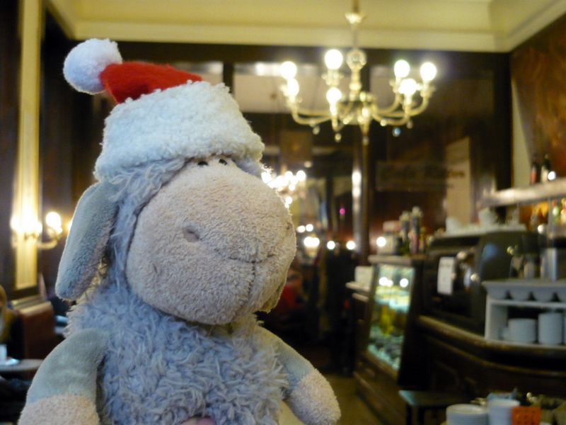 Das Schaf war auf der Suche nach ein paar anderen Weihanchtsgeschichten als denen, die man hier jedes Jahr immer wieder hört und erholt sich von seiner Tour erstmal im Café Ritter. Am spannendsten war es im British Bookshop, wo es gelernt hat, dass „Mäh“ im Englischen „Baa“ heißt . Besonders gut gefallen hat ihm dann ja das Weihnachtsgedicht „A Visit from St. Nicholas“ von C.C. Moore, da konnt‘ es gar nicht glauben, dass das schon 1822 geschrieben worden ist! Vorher gab es für Santa Claus keine Rentiere und auch keinen Schlitten, aber heute kann man sich den Weihnachtsmann gar nicht mehr ohne vorstellen.