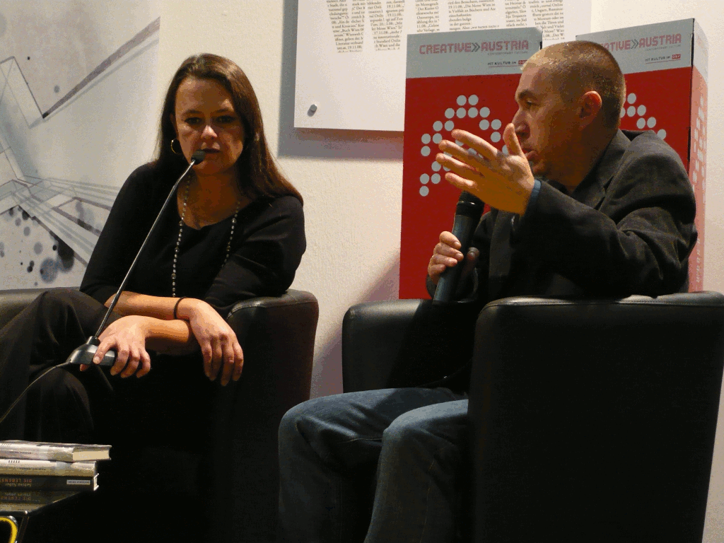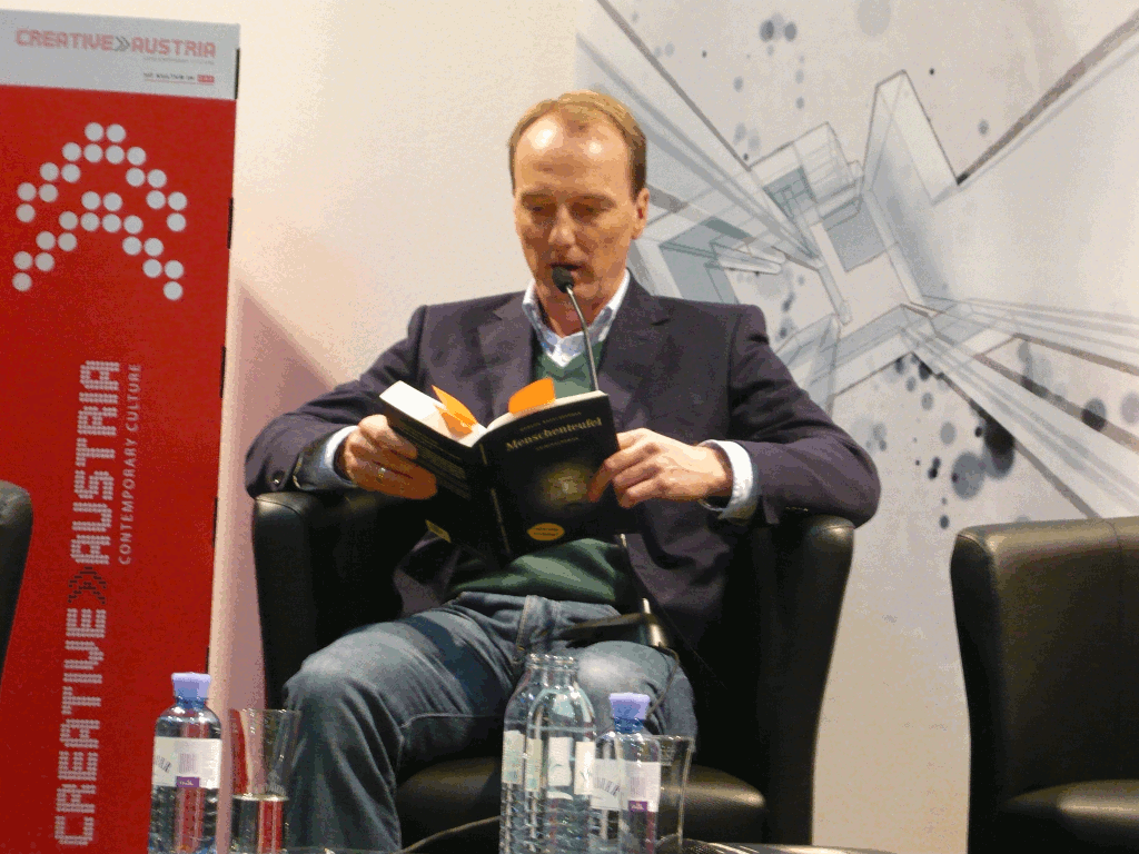 Die Lesungen waren schon sehr nett, wenn auch verbesserungsfähig organisiert – niedrige Standmikrofone auf niedrigem Cuchtisch vor niedrigem Sofa stellen keine optimalen Lesebedingungen dar… Jedenfalls sah man am Donnerstag beim Forum Literatur sowohl Sabina Naber (Die Lebenstrinker) als auch Marcus Rafelsberger (Menschenteufel