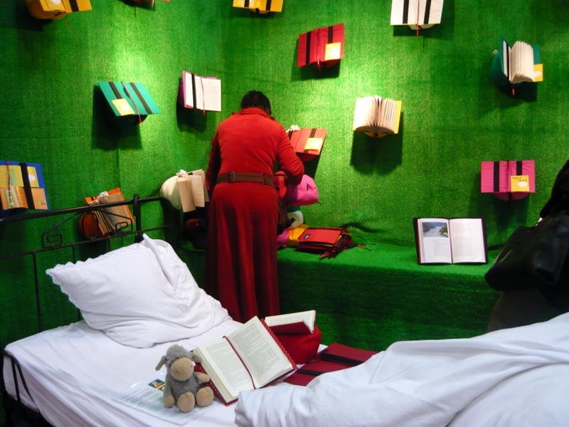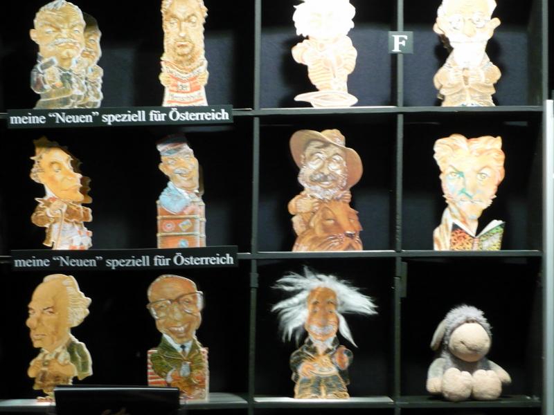 Paperblanks hatte einen ganzen Stand, Sony eReader wurden in schickem Ambiente präsentiert, Hörbücher (Audiamo & der Hörverlag) waren vertreten und eine große Messebuchhandlung gab es auch. Gefreut hat mich persönlich, dass Leselotte einen Stand hatte und besonderen Spaß hatte ich an den Karikaturen-Buchstützen; sehr genial! 🙂