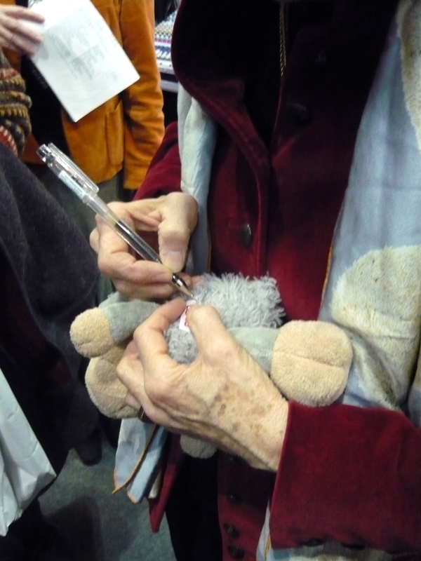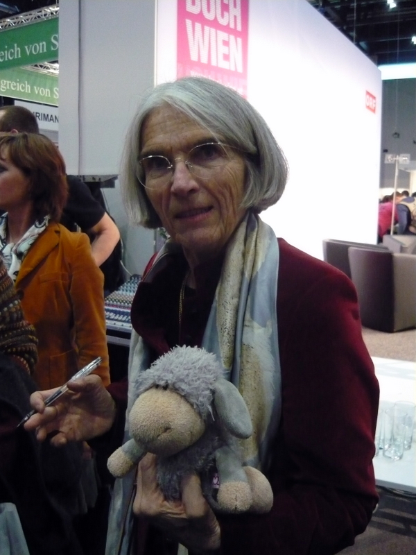 Das Highlight des Tages: Donna Leon. Das Interview mit ihr war auch sehr kurzweilig – über Tiergeschichten, wie man einen Elefanten fängt und wie ein Truthahn ordentlich zubereitet wird. Den wirklichen Spaß hatten wir allerdings kurz vor dem Interview, als Donna Leon noch schnell ein paar Bücher signierte und ich ein Foto machen wollte – eben genau für diesen Artikel hier. Gerade sagte sie noch „I sign everything“ und lachte als ich an die Reihe kam und ihr das wollige Blogmaskottchen in die Hand drücke. Sie hatte es offenbar wörtlich gemeint und signierte promt das Schaf. *lach* Das Foto habe ich dann aber auch noch bekommen… *ggg*