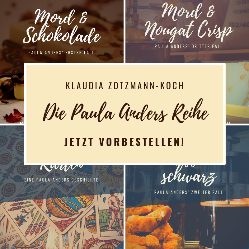 Gestern habe ich gleich zwei Meilensteine auf dem Weg zur Neuauflage der Paula-Bücher erreicht. Zu Mittag war ich mit der Überarbeitung des zweiten Paula-Krimis fertig und habe einen kleinen „Happy-Dance“ vollführt. Dann war mir langweilig und ich dachte, ich schau mir mal an, wie das funktioniert, Bücher zur Vorbestellung auf den Kaufplattformen freizugeben. Stellt sich raus: an sich ganz einfach. Der normale Veröffentlichungsprozess, aber mit Haken bei „zur Vorbestellung freigeben“ samt Datumsangabe. Also habe ich den ganzen Rest des Tages damit verbracht, die vier Paula-Bücher („Mord & Schokolade“, die Kurzgeschichte „Schlechte Karten“, „Mord & Kaffee schwarz“ und „Mord & Nougat Crisp“ – in chronologischer Reihenfolge) auf Tolino-Media (für den deutschsprachigen Buchhandel), Kobo, Draft2Digital (für iTunes, Nook, GoogleBooks) und Amazon einzustellen. Um Mitternacht waren die Bücher bei Amazon bereits zur Vorbestellung verfügbar! Und das, nachdem Amazon das mühsamste Backend hat und zuletzt bespielt wurde.