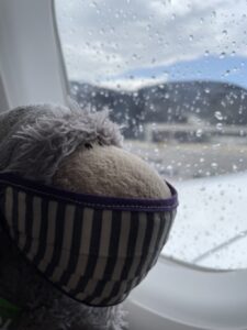 Foto des grauen Schafs vor dem Fenster im Flugzeug, draußen Regen