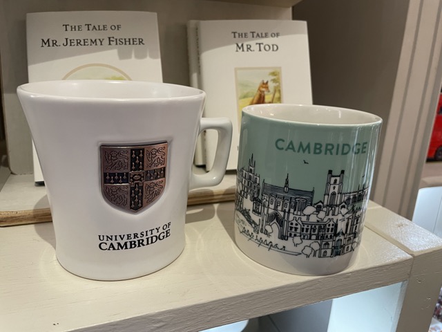 Foto von zwei Tassen in einem Souvenirgeschäft, links eine weiße mit Universität Cambridge Wappen und eine in Grün (eigentlich heißt die Farbe „Cambridge Blue“) mit Wahrzeichen der Stadt