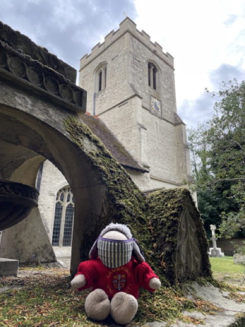 Foto des grauen Schafs vor der Perish Church von Grantchester
