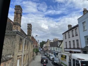 Foto aus dem Park&Ride-Bus oben auf eine Straße in Cambridge mit den typisch englischen Häusern