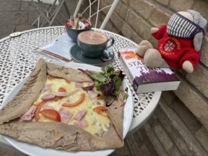 Foto des grauen Schafs, das auf einem Buch sitzt, daneben eine Tasse Kakao und ein herzhafter Crêpe