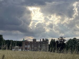 Foto von Madingley Hall von der Vorderseite, ein helles Loch in den Wolken darüber, aufgenommen auf dem Weg zum Three Horseshoes Pub