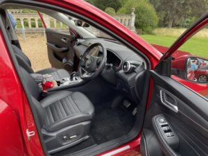Foto des grauen Schafs im roten Pullover auf der Mittelkonsole des roten SUV