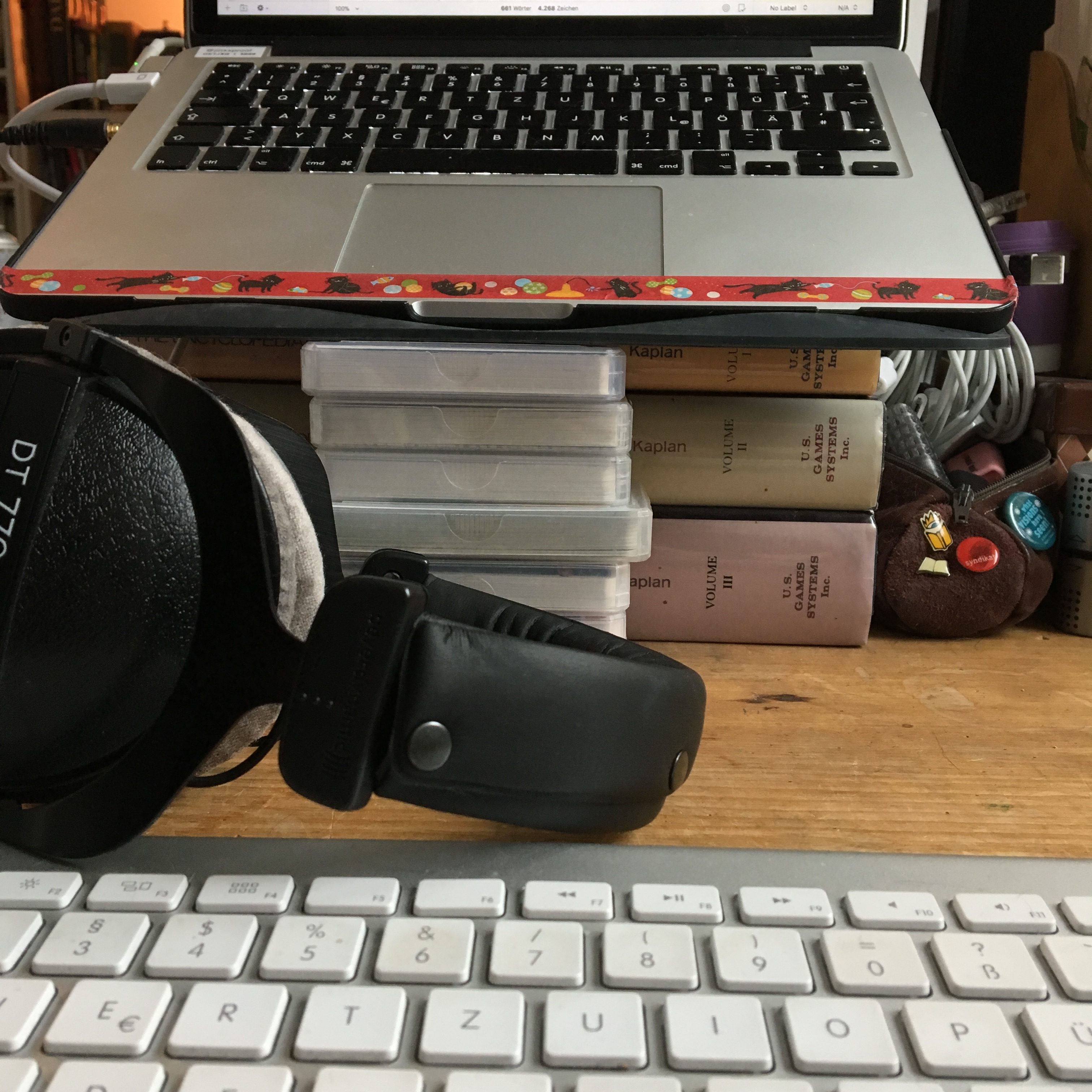 Beim Notebook wurde es etwas schwieriger, da ich gern den Plastikständer vorerst weiterverwenden möchte. Ich mag es ganz gern, wenn es so angekippt vor mir steht, außerdem liegen da ein paar Kabel drunter, die sonst scheußlich im Weg wären. Ich suchte mir drei großformatige Lexika, was von der Höhe her hervorragend hinkam. Allerdings waren sie für den Ständer nicht tief genug. Aber ein Stapel Quartettspiele (Serienmörder, Wiener Kaffeehäuser, etc.) dient jetzt als vordere Stütze. Kleiner Hack, aber funktioniert mal für den Anfang.