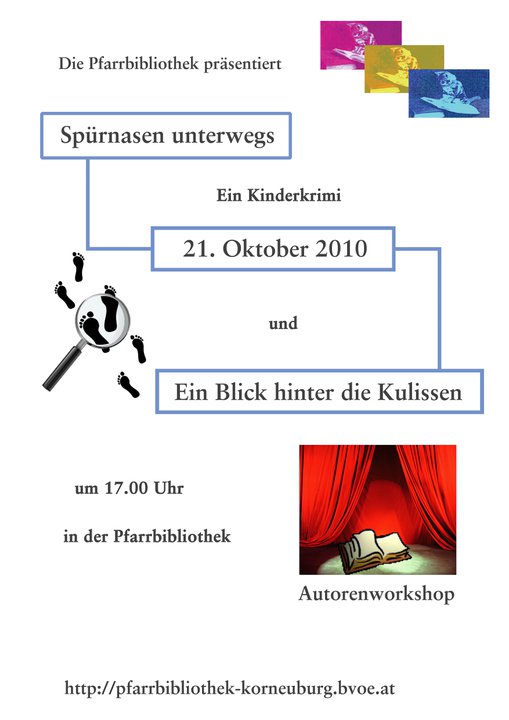 Heute ist der große Krimitag in der Pfarrbibliothek Korneuburg. Im Rahmen der „Österreich liest“ Woche gibt es ab 17:00 Uhr kriminell gute Unterhaltung für alle. Für die jungen Detektive gibt’s eine Schnitzeljagt und für Neugierige einen Blick hinter die Kulissen – von der mörderischen Idee bis zum fertigen Krimibuch.