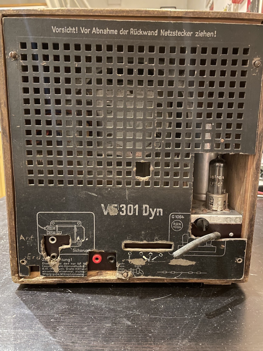 Die originale Rückwand fehlt; die, die dran ist, ist von einem Volksempfänger VE301Dyn. Sie passt von den Abmessungen, nur die Anschlüsse wurden für das jetzige Gerät passend ausgeschnitten. Auch der Lautsprecher könnte durchaus auch aus einem VE301Dyn sein, solche wurden darin wohl tatsächlich verbaut.