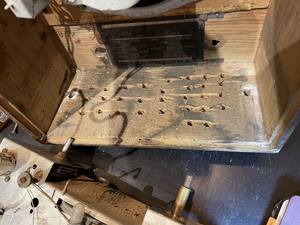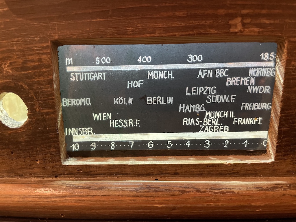 Und dann haben wir noch das Gehäuse, das von den Abmessungen zu den Volksempfängern passt, aber auch deutlich verändert wurde. Die Skala auf der Vorderseite wurde verändert, rechteckig ausgesägt und an die jetzige Skala, vermutlich vom eingebauten Gerät selber angepasst. Uns erreichte ein Hinweis via Mastodon, dass auf der Scheibe der Nordwestdeutsche Rundfunk (NWDR) vermerkt ist, der (laut Wikipedia) 1945 gegründet und 1955/56 in WDR und NDR aufgespalten wurde. Das könnte den Zeitraum des Zusammenbaus (die Bodenlöcher kamen wahrscheinlich später) auf „knapp vor 1956“ eingrenzen.