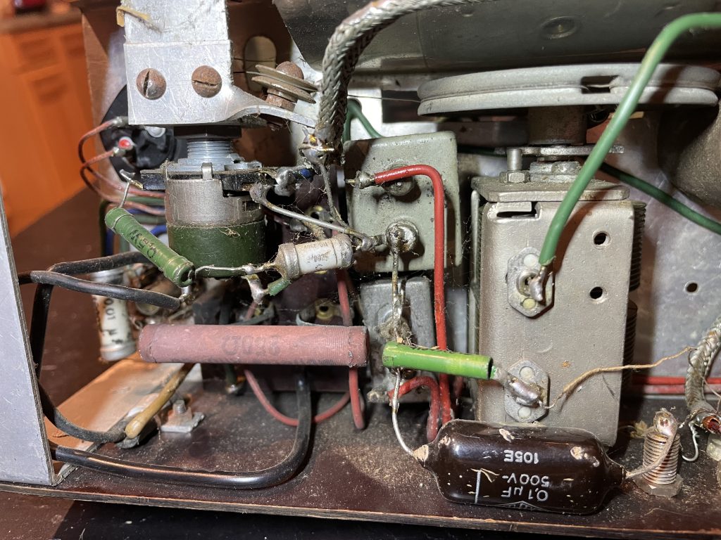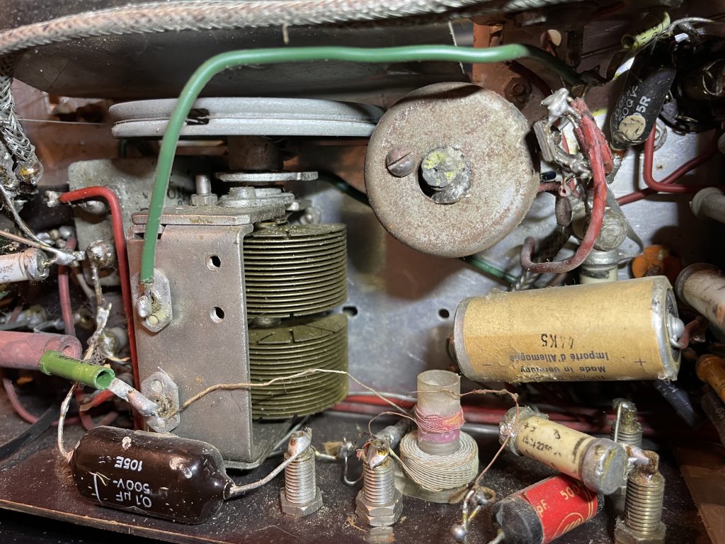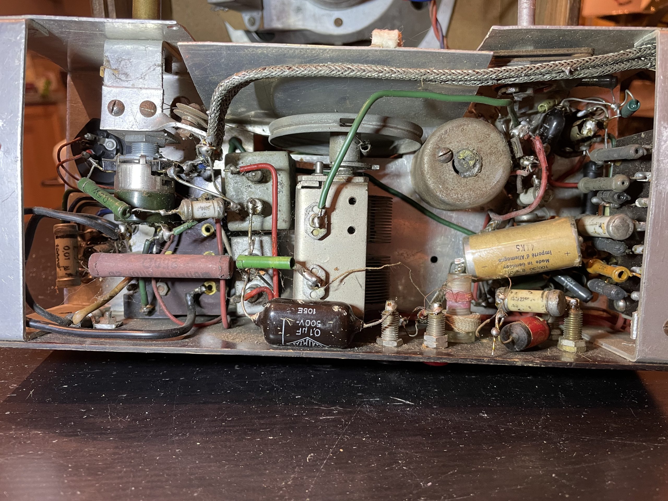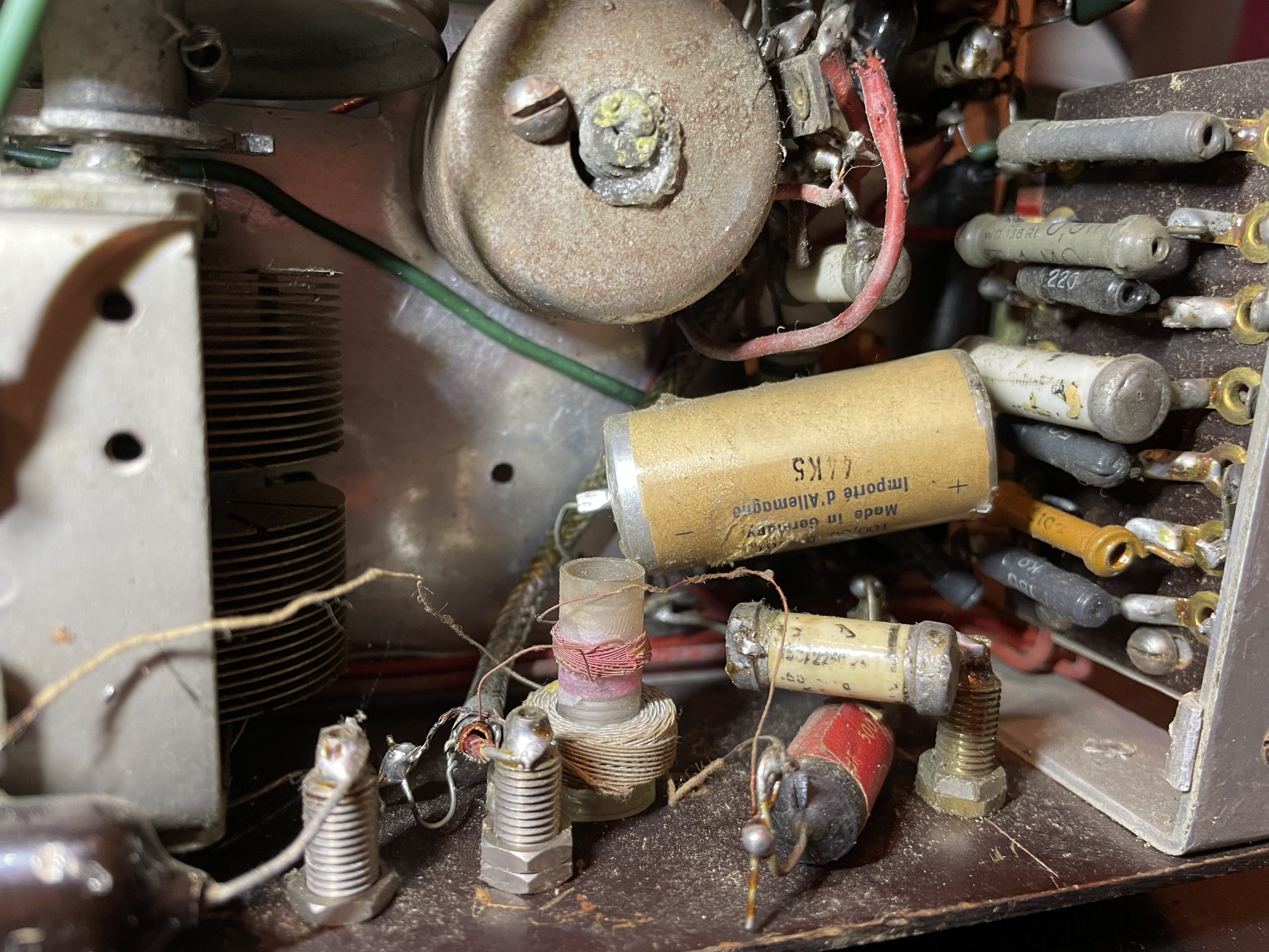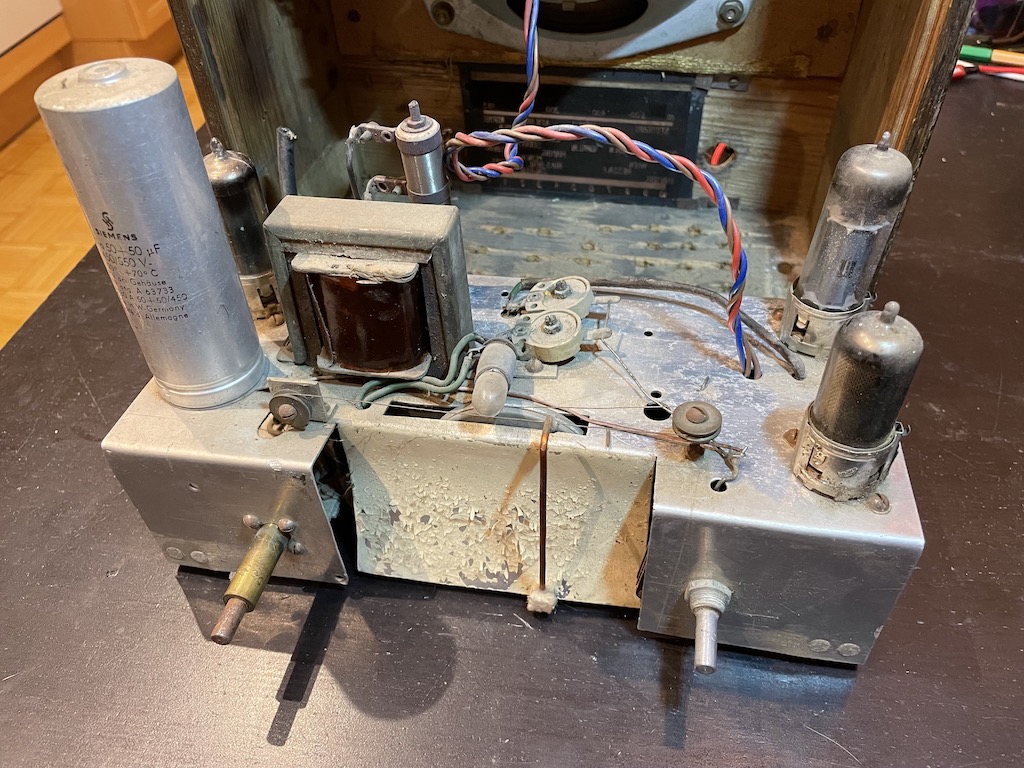 Also, zum Innenleben, dem eigentlichen Gerät. Es ist ein Radio mit drei Röhren, soweit waren wir auch vorher schon. Vermutlich Mittelwelle und/oder Langwelle. Aber ganz so einfach macht es uns das gute Stück leider nicht. Es wurde nicht wild daran herumgeschraubt, zumindest das eigentliche Innenleben sieht sehr „aus einem Guss“ aus. Allerdings mit Bauteilen wie etwa einem Elektrolyt-Kondensator von Siemens mit dem Logo, das sie von 1936 bis 73 verwendet haben und der Aufschrift „Made in W. Germany“. Das Gerät selber könnte aus den 1950ern oder frühen 1960ern sein. Leider haben wir sonst keine Anhaltspunkte, um welchen Hersteller es sich handelt oder gar, welches Gerät es ist.