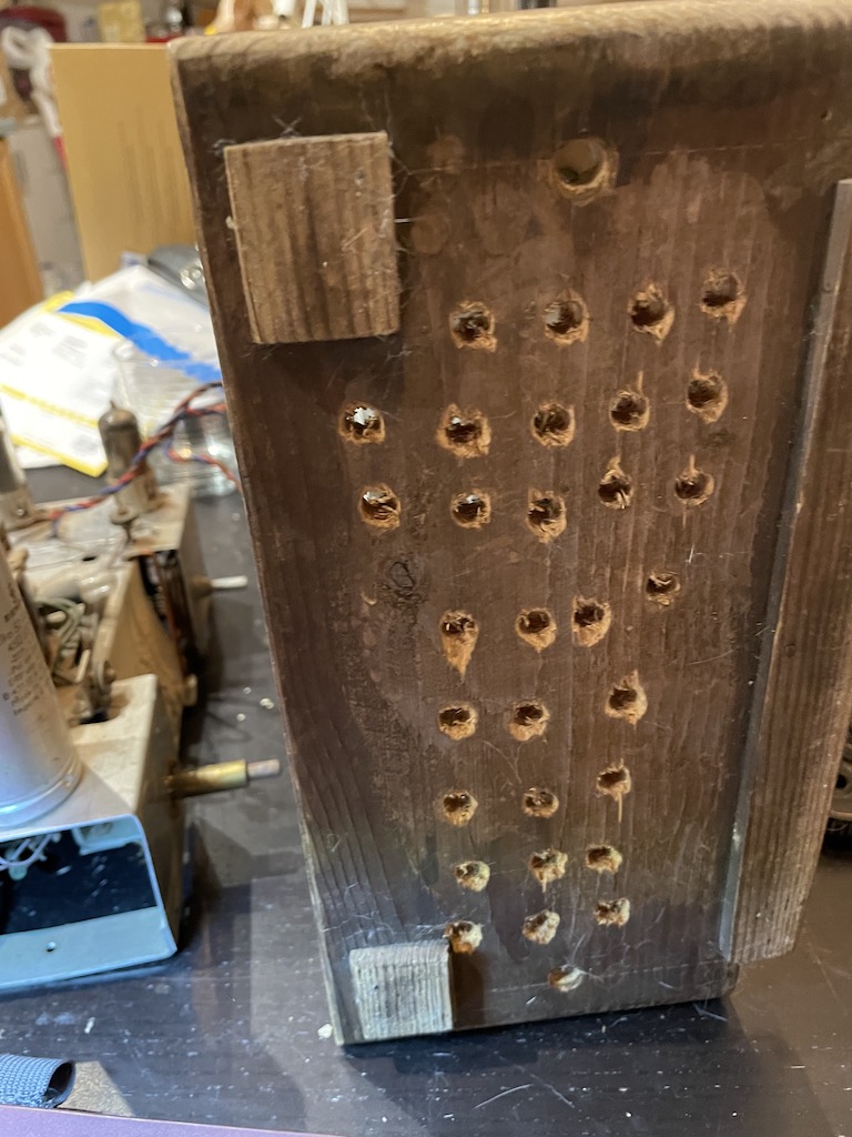 Die Lautsprecherhalterung sieht auch so aus, als wäre sie nachträglich zum jetzigen Lautsprecher passend eingebaut worden. Die Löcher für die beiden Drehregler könnten ebenfalls nachträglich ausgesägt worden sein, zumindest ist die Schnittkante nicht wie die Außenseite gebeizt.