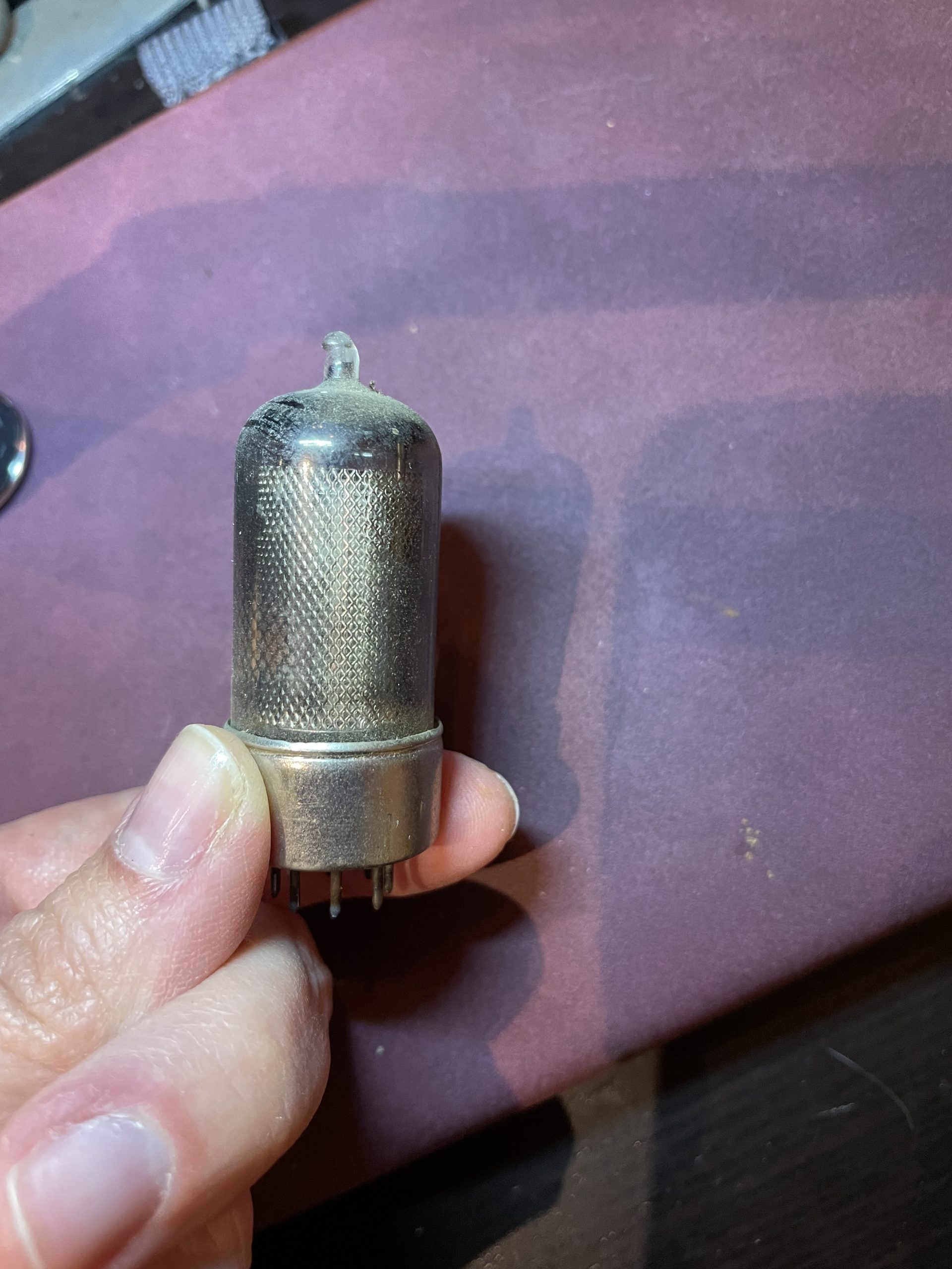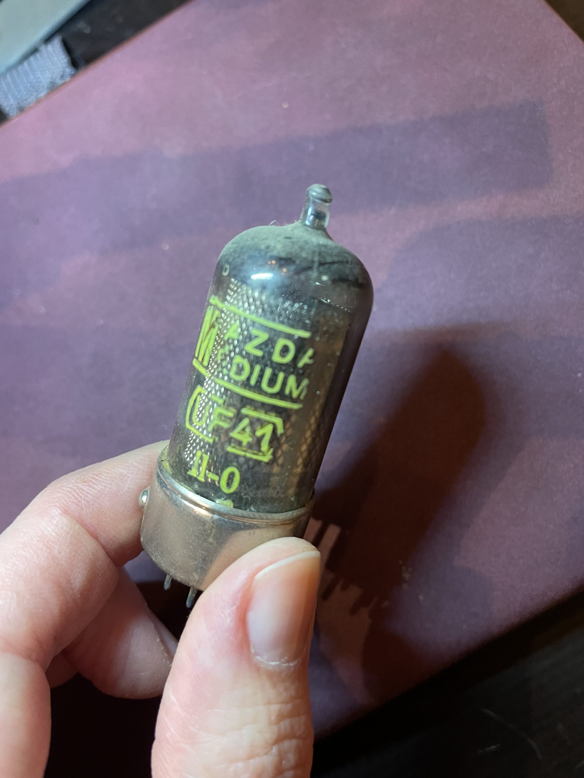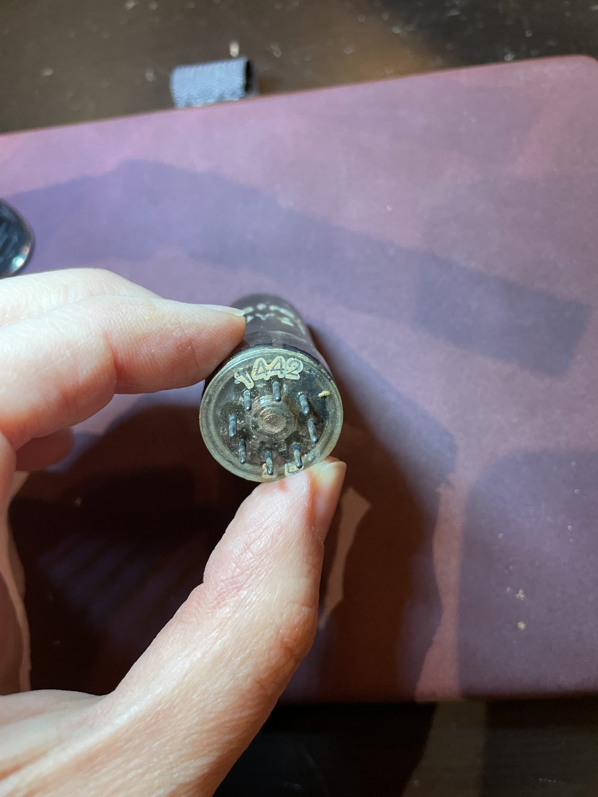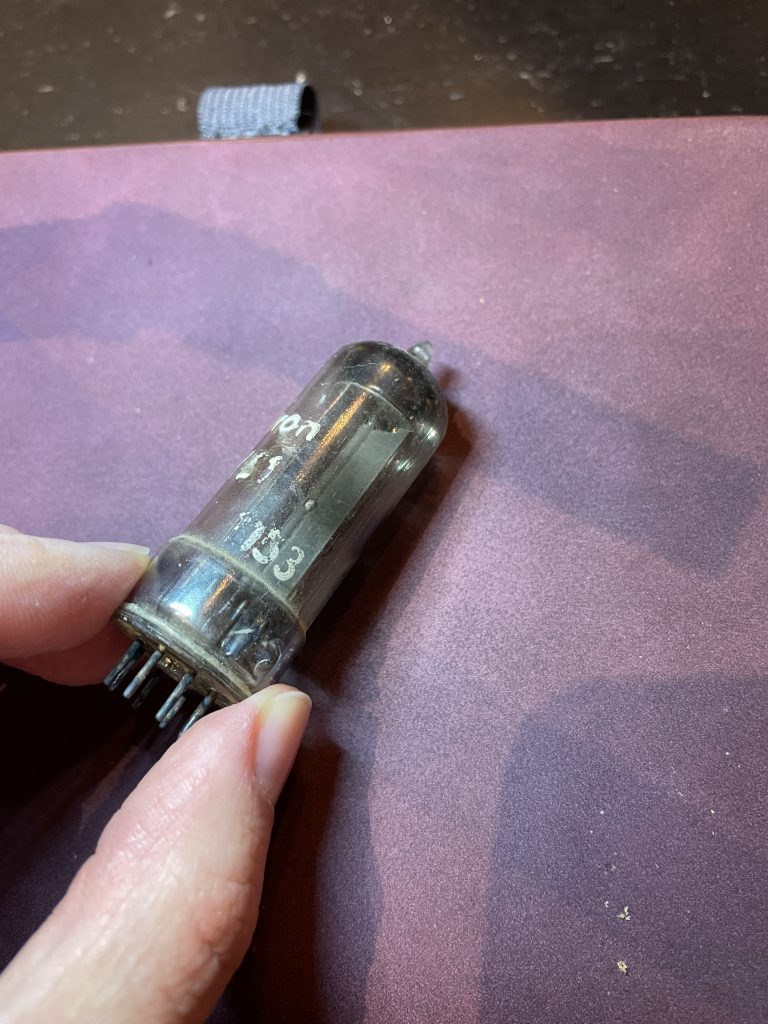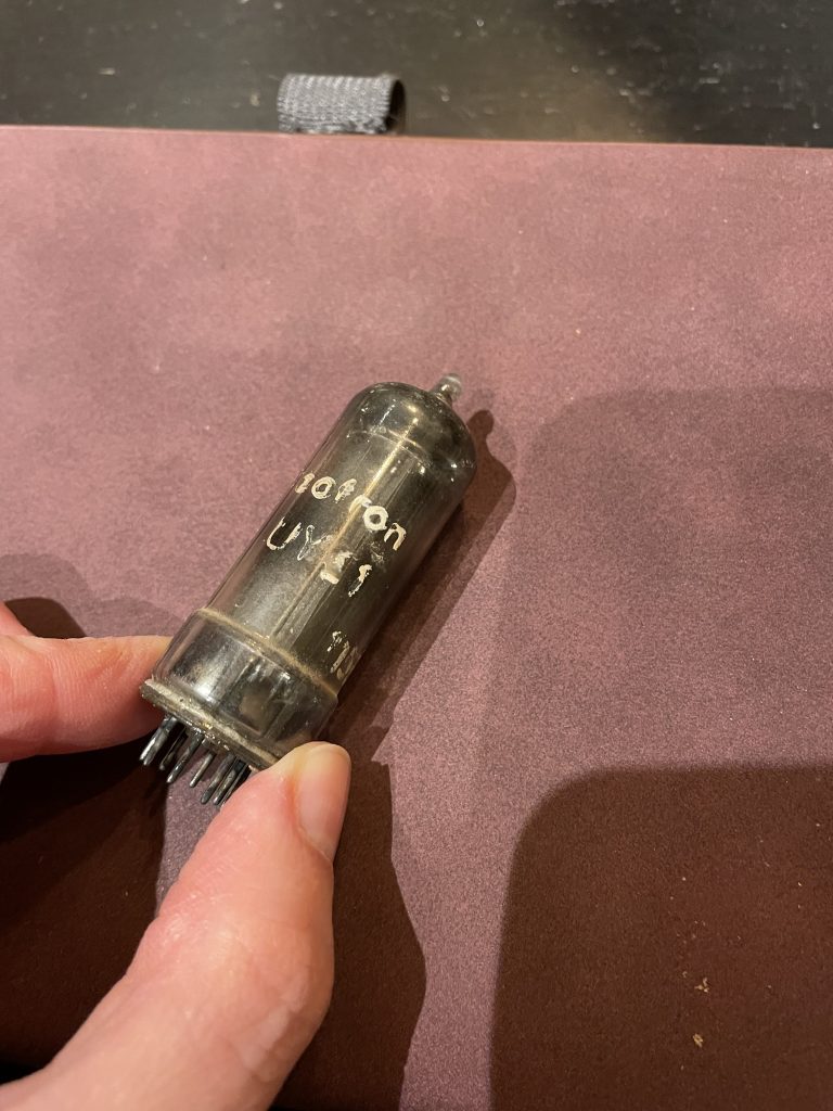 Von den 3 Röhren sind leider nur zwei, eine davon unvollständig beschriftet mit „iotron“ und „UY…??“ und „?153“ [Angaben ohne Gewähr]. Auf der Unterseite stehen die Ziffern „1442“ über dem Ring aus 8 Pins. Vermutlich eine „Radiotron“, die wurden mit „UY-“ Nummern ausgegeben. Uns erreichten zwei Hinweise auf die UY41-Gleichrichter-Röhre, die bei der Baugruppe für Spannungsversorgung ein wirklich guter Tipp ist. Herzlichen Dank!