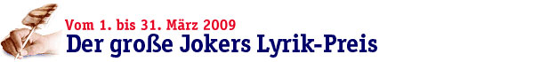 Es ist mal wieder so weit – wie jedes Jahr im März findet auch heuer wieder der Jokers Lyrik-Preis statt. 2.000,-€ gibt es für das beste Gedicht. Die ersten 13 Plätze werden insgesamt mit Preisen im Wert von 5.000,-€ dotiert. Dazu kommen noch Preise von Jokers-Partner und außerdem werden die besten Texte in einer Lyrik-Anthologie veröffentlicht.