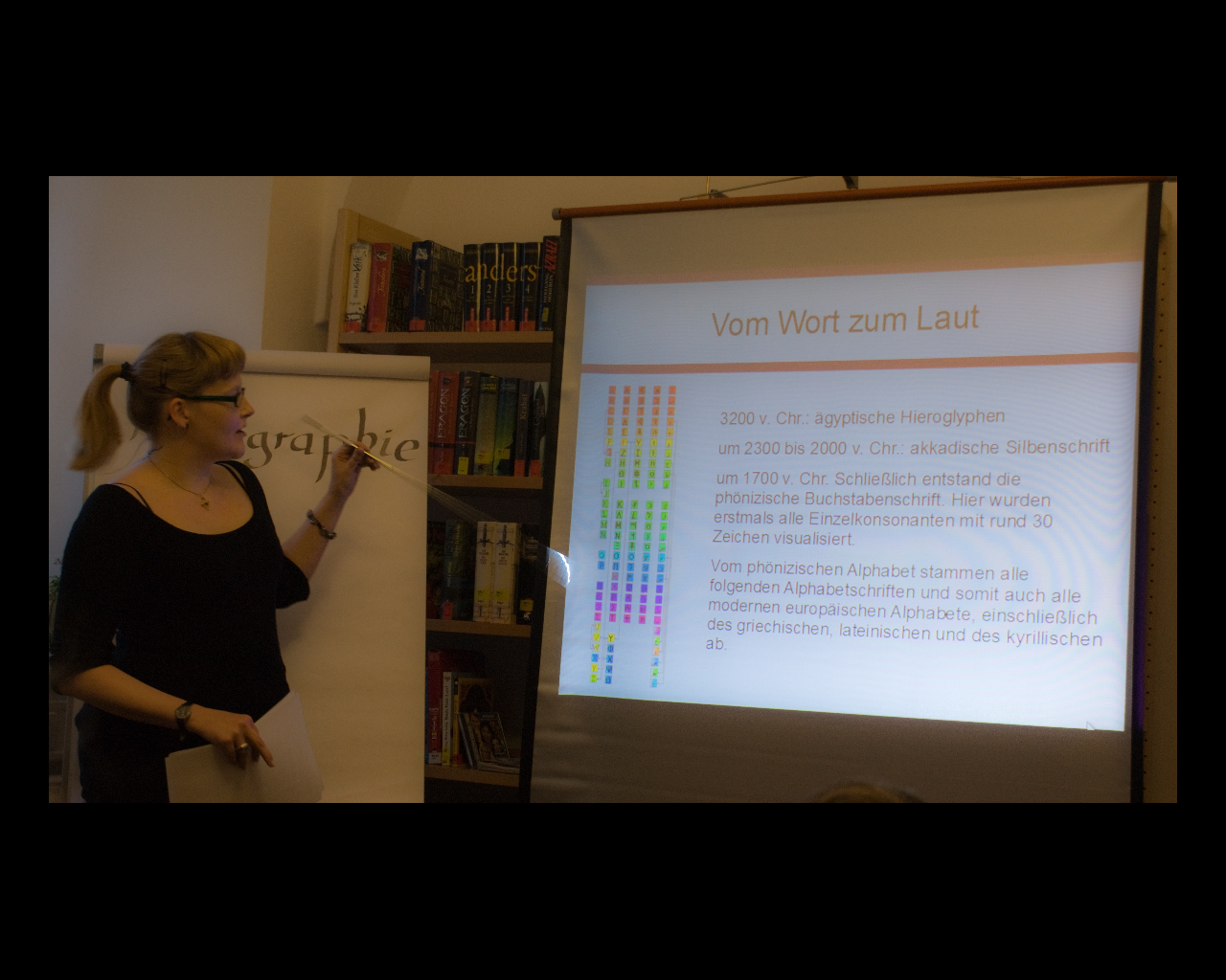 Die Kurzfassung: Es war super! Die Räume der Pfarrbibliothek Korneuburg waren voll mit interessierten Besuchern und ich war schrecklich aufgeregt. 😉 Der Vortragteil lief gut und die ganzen Anschauungsobjekte, die ich mitgebracht hatte, wurden neugierig beäugt, betastet und weitergegeben – Muster von Pergament und verschiedenen Qualitäten Büttenpapier machten ihre Runden und die Besucher gingen mit den unterschiedlichen Kalligraphiematerialien auf Tuchfühlung.