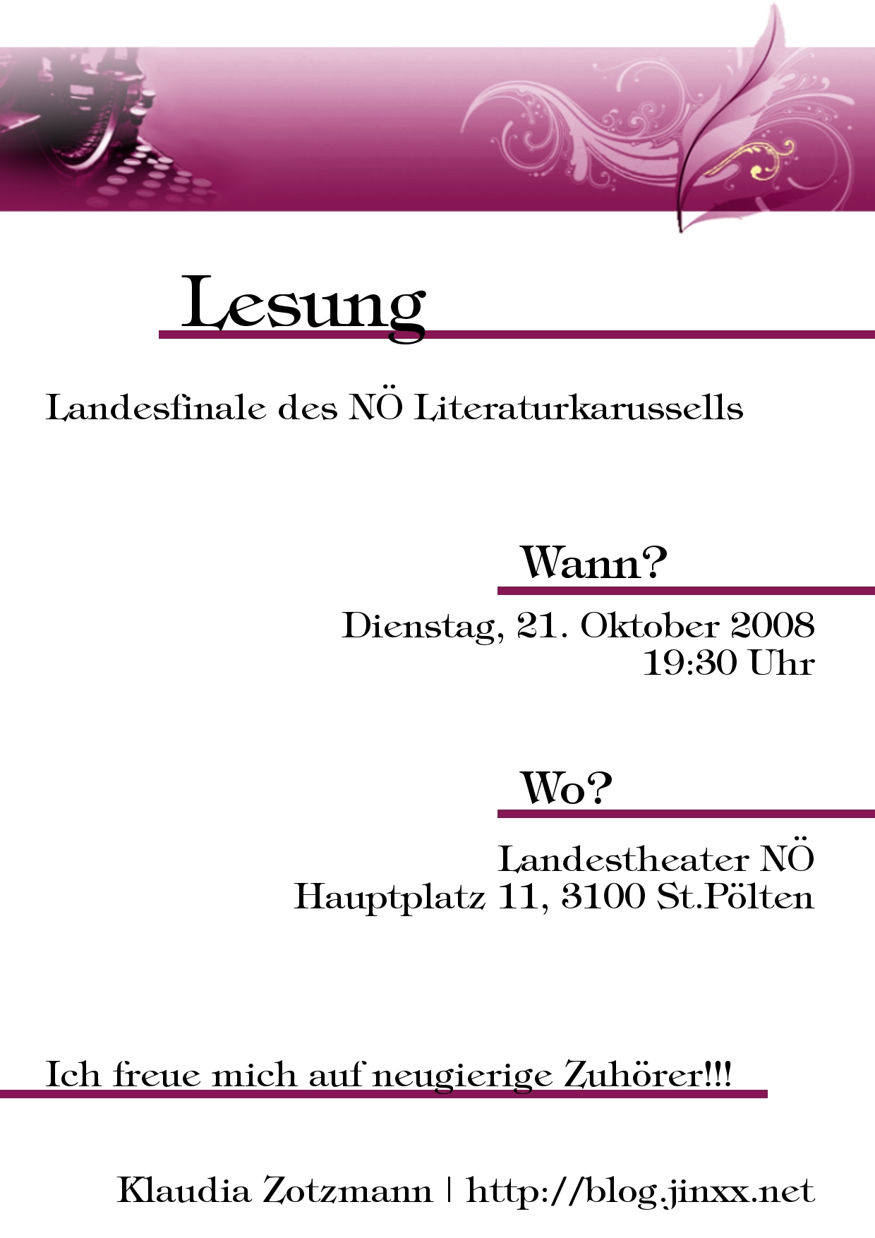 So langsam nähert sich das Landesfinale des NÖ Literaturkarussells; am Freitag war die offizielle Einladung im Postkasten. Nachdem ich ja am 28. März den 1. Platz im Weinviertel – und damit meinen ersten Literaturpreis überhaupt – gemacht habe, ist das landesfinale wohl ein Pflichttermin.