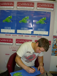 Aber: gestern war Joscha Sauer, der Zeichner der Nichtlustig Comics in Wien und da dachte ich, ein signiertes Buch wäre sicher ein nettes Geschenk. Ist es auch. Vor allem, weil sich Joscha Sauer auch wirklich für jeden einzelnen Zeit genommen und jedem ein Bild ins Buch gezeichnet hat. Das Problem lag da bei „jedem“ – es war nämlich gesteckt voll beim Morawa auf der Wollzeile und als ich nach dreieinhalb Stunden endlich drankam, tat mir schon das ein oder andere Körperteil weh. Aber es hat sich gelohnt!