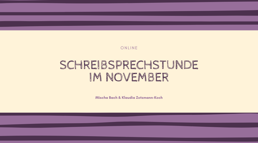 Alles Grau in Grau und nur Nebel im Kopf? Das muss der November sein, sollte aber niemand am Schreiben hindern. Aber wenn es doch etwas gibt, das hakt, wenn die Ideen nicht kommen wollen, die Plots stecken bleiben und die Figuren mal wieder überhaupt nicht machen was sie sollen – lasst uns drüber reden. Die nächste Schreibsprechstunde mit Klaudia Zotzmann-Koch und Mischa Bach bietet dafür allemal Gelegenheit.