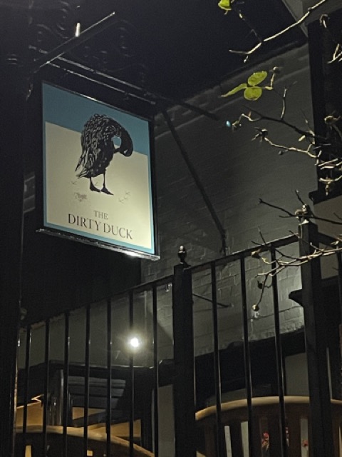 Nach dem Theater-Marathon ging es zum krönenden Abschluss ins Dirty Duck. Auf dem kurzen Fußweg hatte ich mich weitestgehend wieder im Griff und den Wimperntusche-Panda ausreichend verwischt. Wir waren noch keine zwei Meter weit drinnen, standen wir auch schon neben dem jungen Orlando vom Vormittag und die junge Rosalind kam uns entgegen – die Chance, ihr Danke zu sagen, habe ich natürlich genutzt. Der Cast von As You Like It hatte hinten im nächsten Raum die Abschlussfeier des Stücks. Auf zur Bar und einen halben Pint bestellt, einen ganzen bekommen. Das fängt ja gut an.