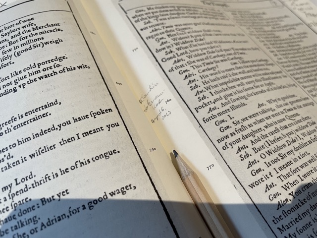 Drinnen im Nachbarhaus ist die Ausstellung; in diesem Jahr mit Schwerpunkt um das First Folio, die erste gedruckte und gebundene Ausgabe von 36 von Shakespeares Werken, die sieben Jahre nach Shakespeares Tod von zwei seiner Freunde, John Heminges und Henry Condell, herausgegeben wurde. Das war 1623, also vor 400 Jahren. Ich hab mich auch in die ausliegende Kopie des First Folio eingetragen. Nicht so cool, wie in eine Fensterscheibe ritzen und danach groß rauskommen und berühmt werden, aber hey. ;D