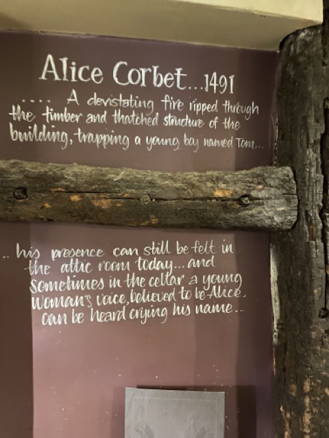 Eigentlich wollte ich danach noch zur Holy Trinity Church, wo Shakespeare begraben ist, aber erstmal musste ich einen Happen essen – mehr als zwei Maulbeeren – und so saß ich dann im Garrack Inn, dem ältesten Pub in Stratford, das schon seit frühester Zeit ein „haunted place“ ist. Nach einem Feuer in den 1490ern (kein Typo), soll man einen Jungen noch immer auf dem Dachboden spüren, wo er damals eingeschlossen verbrannte. Und seine Freundin hört man unten im Erdgeschoss noch nach ihm rufen. Sagt man. Und die Tafel, neben der ich gesessen und gegessen habe. Auf jeden Fall auch Stoff für Geschichten.