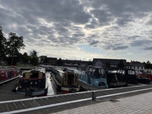 Foto von mehreren Narrow Boats, die alle vertaut nebeneinander in dem winzigen Hafen von Stratford liegen