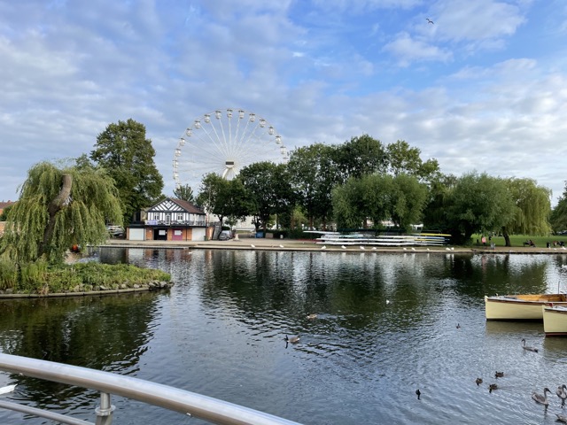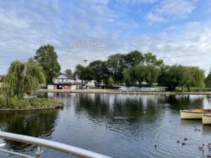 Foto über das Wasser hinweg zu einem Riesenrad hinüber