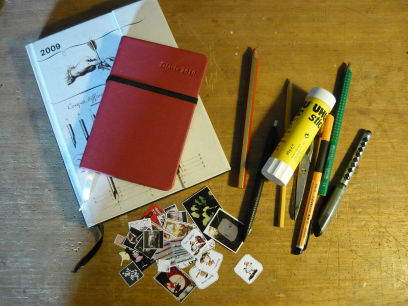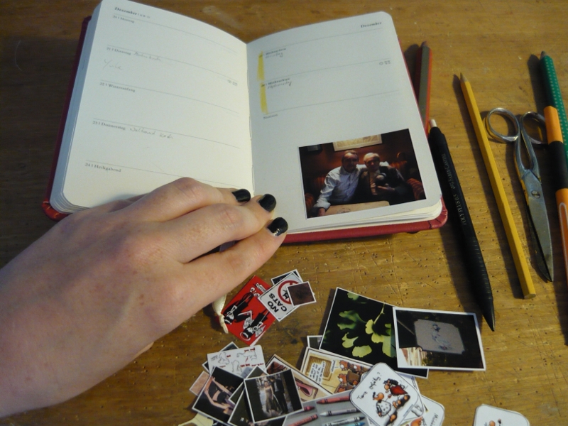 Zuerst suche ich in meinem Bilderordner am Rechner all die Bilder zusammen, die mir besonders gut gefallen – Fotos vom letzten Urlaub, kleine Cartoons, LOL-Cats, alles, was mir gefällt. Seit meinem letzten Geburtstag gibt es einen Farblaserdrucker im Haus 🙂 im letztn Jahr bin ich mit all diesen Bildern auf einem USB-Stick dann zum Copyshop meines Vertrauens gepilgert und habe sie mir ausdrucken lassen. 2 DinA4-Seiten Farbdruck bringen einen heutzutage preislich ja auch nicht mehr um. Dann alles ausschneiden und nach passenden Daten für die einzelnen Bilder suchen. Beispielsweise „Bild von einer Katze mit Weihnachtsmütze“ -> „Weihnachtswoche“; „Bild von meinem Freund“ -> „unser Jahrestag“, etc. „Bilder von Schreibgeräten“ -> „November“ (NaNoWriMo). 😉