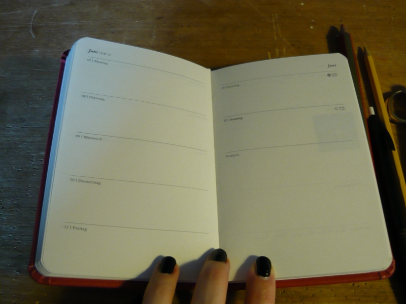 Warum ich überhaupt noch einen Papierkalender benutze wenn ich doch ein iPhone habe? Ganz einfach. 1. können digitale Daten verloren gehen (oder gar das Telefon gestohlen werden…) und 2. trage ich ganz gerne Ereignisse im Kalender ein, für die ich im iPhone sicher keinen „Termin“ oder so etwas anlegen würde. Beispielsweise: „Kuchen backen“, „Brief an … abgeschickt“ oder „neue Brille abgeholt“ – dann kann ich nachschauen, seit wann ich die Brille habe, auch wenn ich die Rechnung dazu verschlampen würde.