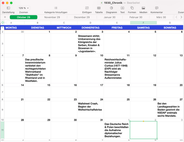 Aber zuerst verrate ich Euch noch, was ich heute gemacht habe: Eine Chronik für das #Projekt1930 in einen tatsächlichen Kalender geworfen. Ich hatte weite Teile davon bereits als Liste, aber eine liebe Autorenkollegin gab mir gestern den Tipp, das in einen Kalender zu packen, da so der Überblick viel besser ist und man die Wochentage auch wirklich vor sich sieht, was wann passiert ist.