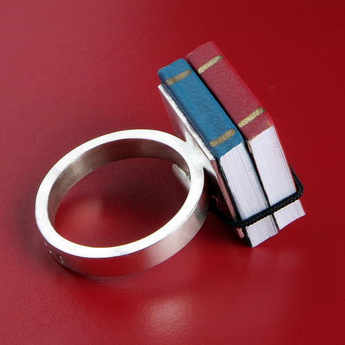 Gerade via bookart.soup.io gefunden: der BookRing; Design by Ana Cardim. Genau das Richtige für Bibliophile, die in jeder Situation ein Buch dabeihaben wollen. Zum Schwimmengehen oder Abwaschen sollte man das gute Stück aber wohl besser abnehmen…