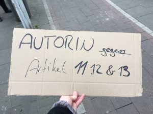 Anti-Artikel13-Demo in Köln – Demoschild mit dem Text: „Autorin gegen Artikel 11, 12 & 13“