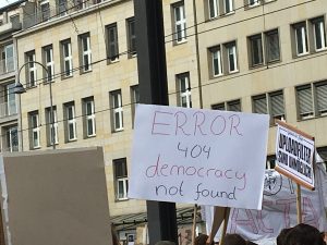 Anti-Artikel13-Demo in Köln – Demoschild mit dem Text: „ERROR 404 democracy not found“