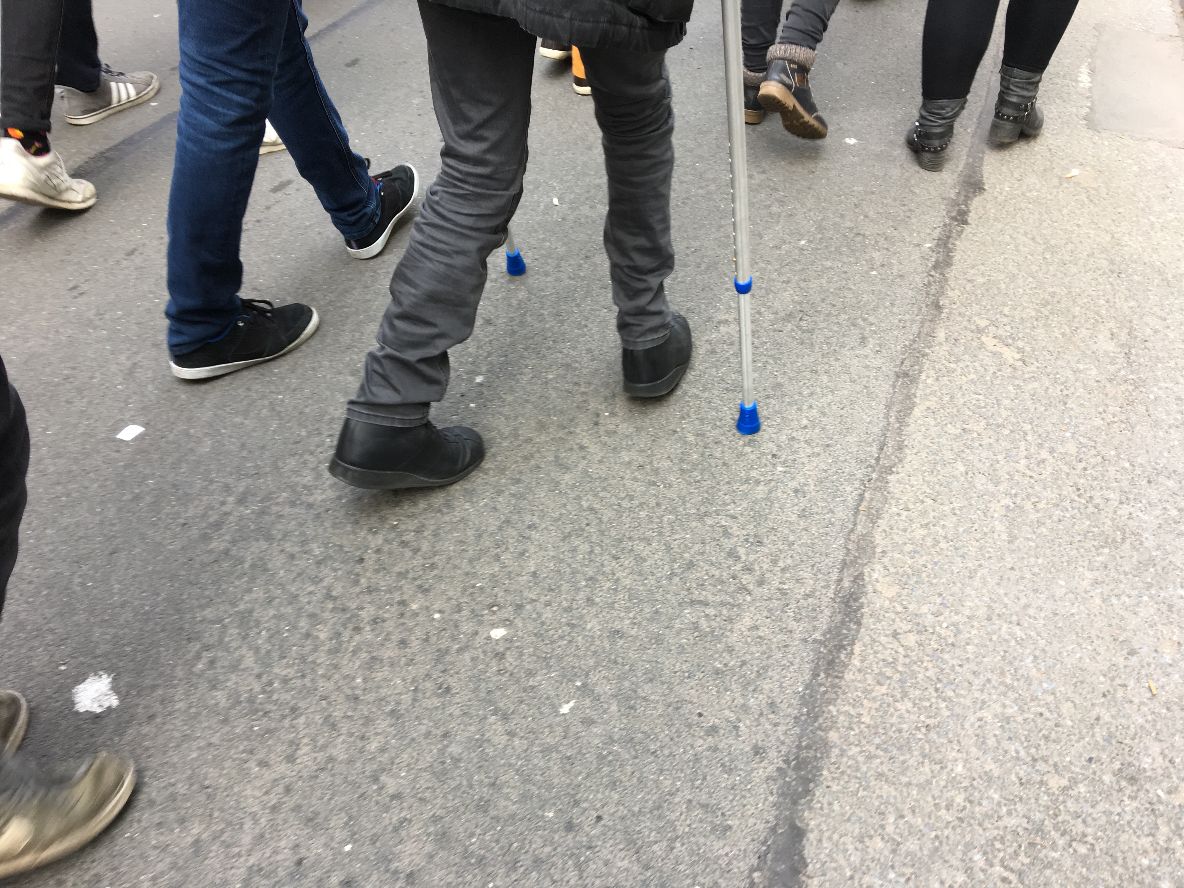 Anti-Artikel13-Demo in Köln – Foto eines Menschen, der die gesamte Demo auf Krücken mitgelaufen ist