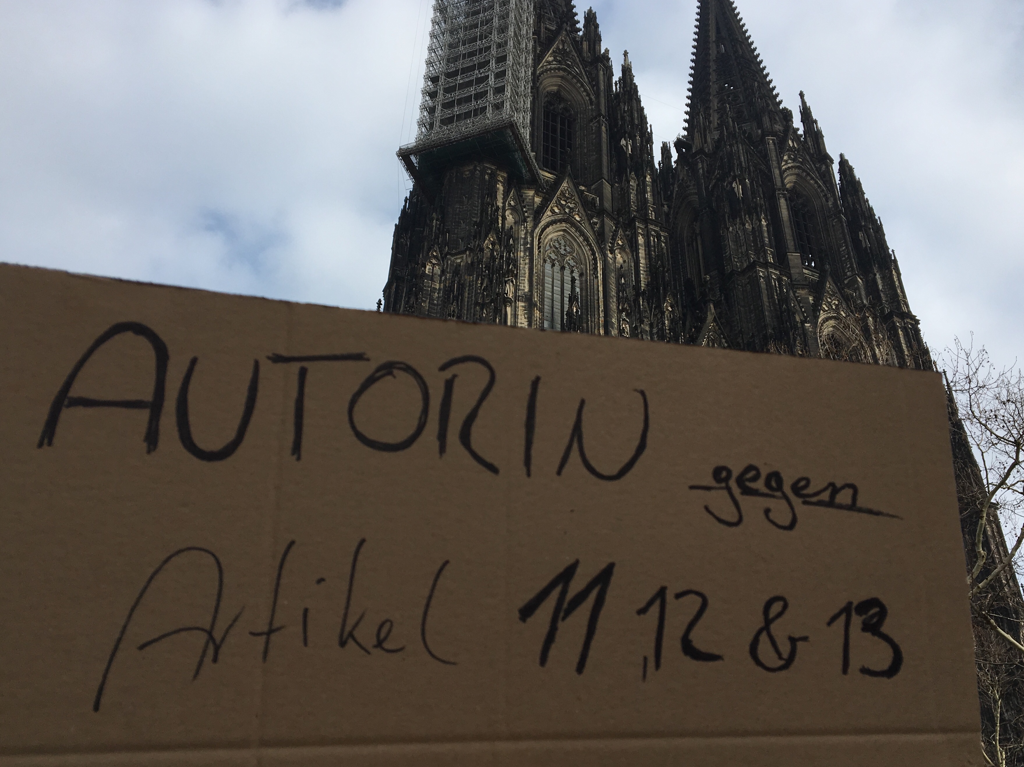 Anti-Artikel13-Demo in Köln – Demoschild mit dem Text: „Autorin gegen Artikel 11, 12 & 13“ vor dem Kölner Dom